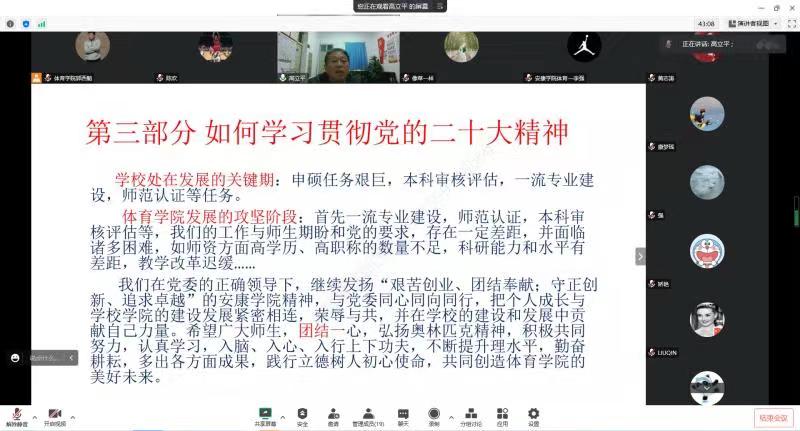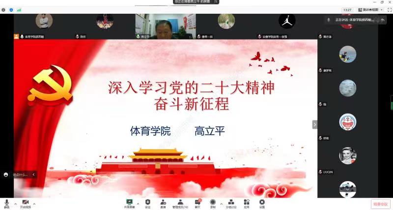 本次工会活动运用“腾讯会议”软件以线上形式开展,邀请人人看人人摸党总支书记高立平同志为人人看人人摸全体教师作了题为《深入学习党的二十大精神—奋斗新征程》的主题报告,从党的二十大召开概况;党的二十大的主要精神和如何贯彻党的二十大精神等三个方面进行了宣讲。