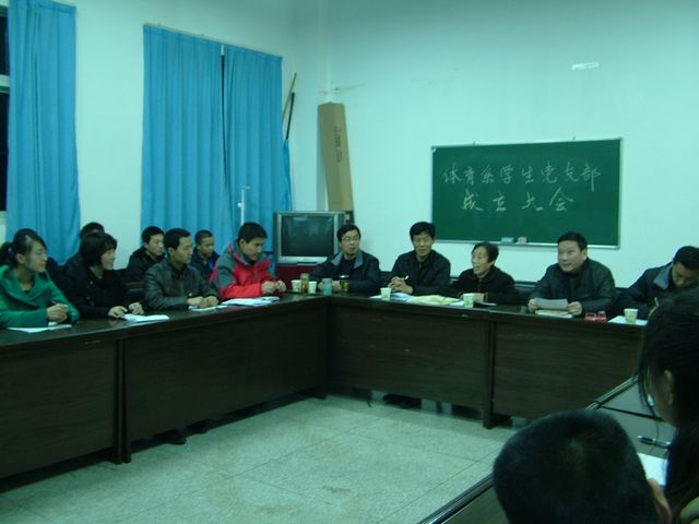 2011年3月14日晚七点半,体育系党总支在体育系会议室召开了学生党支部成立大会,党总支书记冯德学、副主任许宝林、党总支组织委员系副主任鲁宗成、退休干部体育系特邀党建组织员薛荫惠、办公室主任黎远军、辅导员梁鸿、党总支组织委员郑白雨、体育系全体学生党员及近期确定的16名发展对象参加了会议。