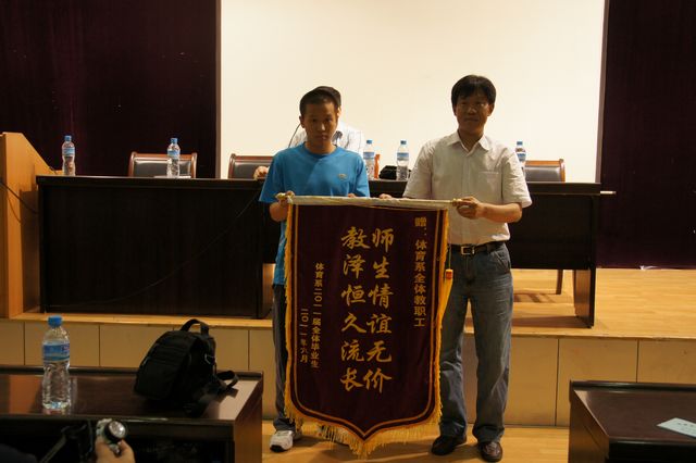 会议结束前,毕业生与体育系互赠纪念品,朱涛、雷崇毅老师分别献歌一首,毕业生也用歌声表达了自己的情感,大会在师生依依不舍的道别祝福声中结束。