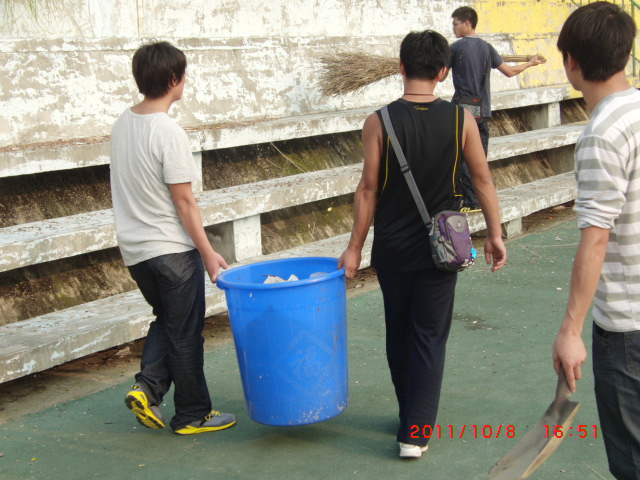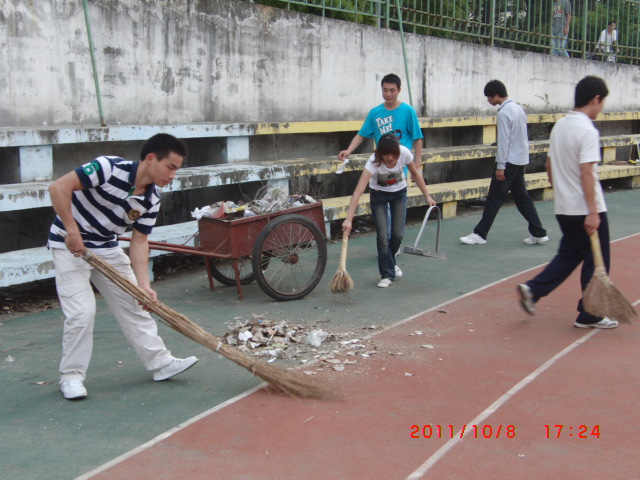 30多名志愿者手拿扫帚、垃圾铲、垃圾桶、垃圾车等工具,清扫田径场草坪、跑道、看台的垃圾,清理看台卫生死角的果皮、纸屑及杂草,通过一个多小时的辛勤劳动,把整个田径场打扫得干干净净。