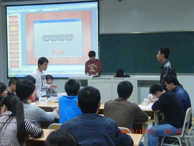 21日晚,辩论赛决赛在1027教室举行,各支队伍及助威团100余人参加了比赛。主持人介绍完辩论赛规则后辩论正式开始。双方辩手开场前先自我介绍以示友好,然后进入到了激烈的辩论中。辩论赛分为五个环节:正反方一辩进行议论陈词;一方的二辩选择对方的二三辩进行攻辩盘问,再由三辩选择对方的二三辩进行攻辩盘问;一辩进行攻辩小结;双方进行自由辩论;双方四辩进行总结陈词。比赛在和谐、融洽、热烈的气氛中进行。