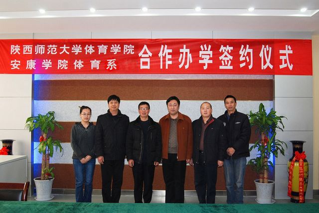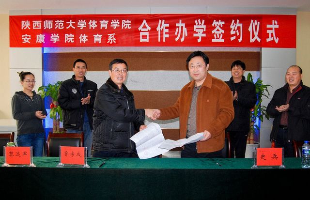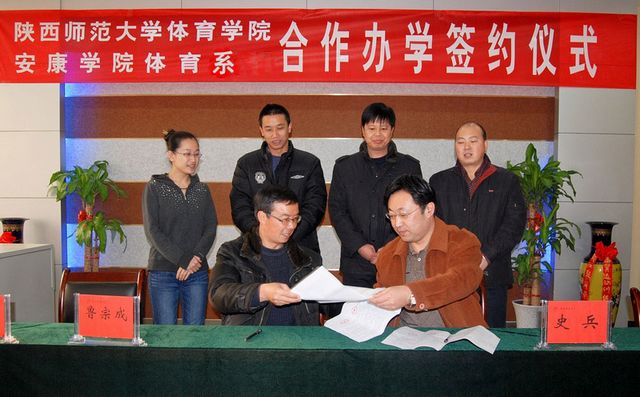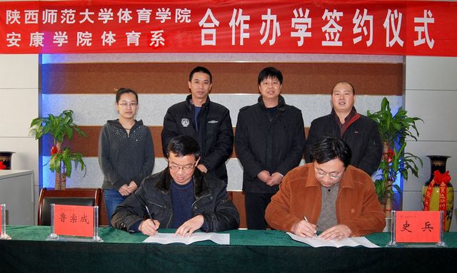 为落实陕西省委、陕西省政府关于加快陕南高等教育事业发展步伐的战略决策,12月26日下午15:00,我系与陕西师范大学人人看人人摸在师大体院多媒体教室签订了“陕西师范大学人人看人人摸 安康学院体育系支持办学协议书”,副主任鲁宗成代表体育系与师大体院史兵院长在协议书上签字。陕西师范大学人人看人人摸副院长康喜来、杜炳志、分党委副书记袁冰以及我系办公室主任黎远军参加了签约仪式。