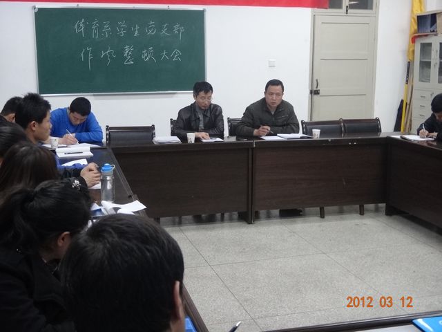 2012年3月12日晚19:30,在体育系会议室,由系党总支书记沈军老师主持召开了体育系学生党支部作风整顿大会,学生党支部书记、辅导员郭建鹏老师、全系学生党员、入党积极分子共31人参加了会议。