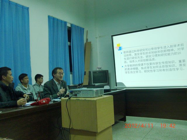 2012年4月12日晚7:30,在系主任冯德学的主持下,全系专职教师参加了教科研工作恳谈会。学院办学顾问、我系学科带头人熊正英教授做了题为《科学研究的功能与教师的责任》的报告。