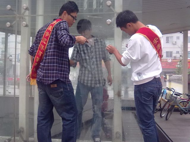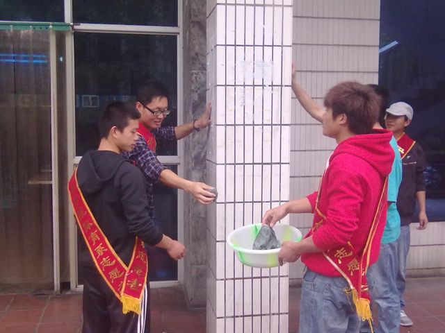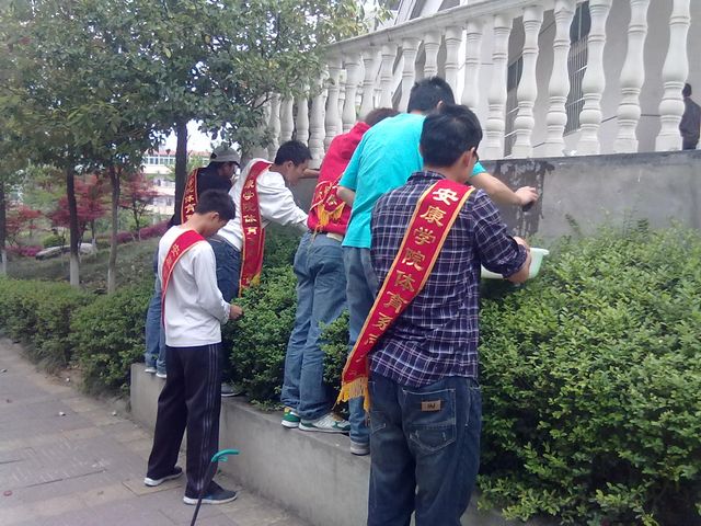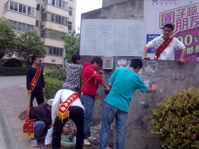 我系志愿者服务队组织10余名同学带着水盆、抹布、清洁球、铲子等劳动工具,深入校园的各个角落,见到墙上贴的、喷的、画的各种宣传广告,就先用抹布蘸上水泡湿,再用钢丝清洁球、铲子清理,见到乱丢的垃圾就捡。经过两个多小时的奋战,校园墙面被清理一新。