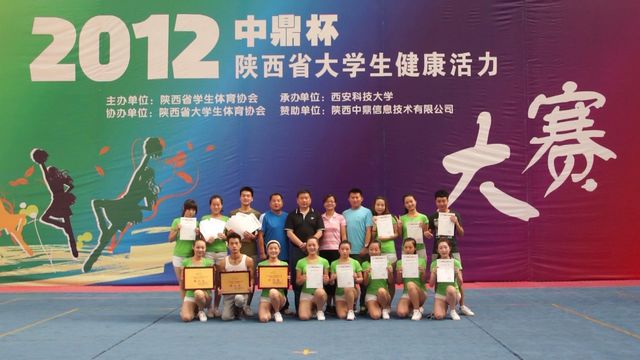 2012年陕西省大学生健康活力大赛于6月9—10日在西安科技大学举行,本次大赛共有来自全省44所高校、873名运动员参加。我院组队参加了体育院系组其中4个项目的比赛,均取得优异成绩:大众四级第二名,花球一级第三名,踏板规定套路第三名,健身排舞第三名,团体总分名列第五,实现了是我校健美操队竞赛成绩的新突破。