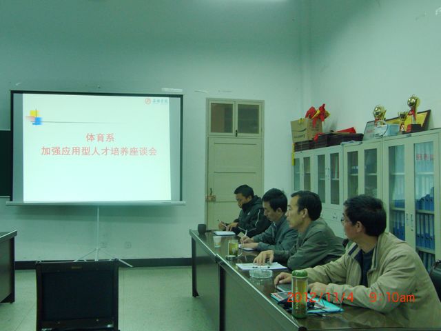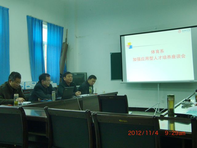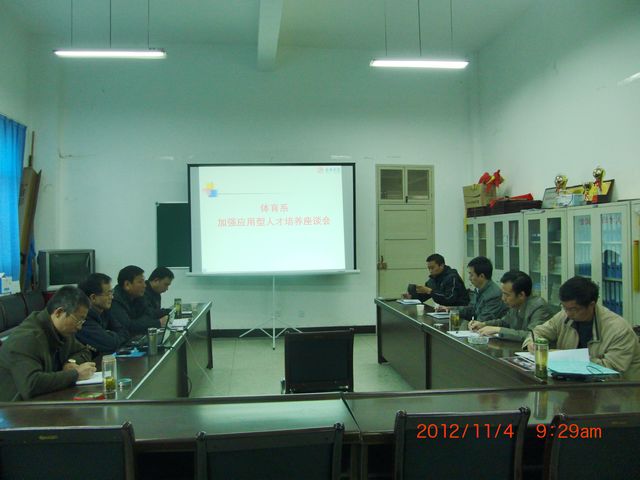 2012年11月4日上午九点,体育系“加强应用型人才培养座谈会”在会议室召开。学校党委副书记、纪委书记闵小平、教务处副处长杨哲、学校办学顾问熊正英以及体育系党政班子成员、办公室主任、辅导员等参加了座谈会。
