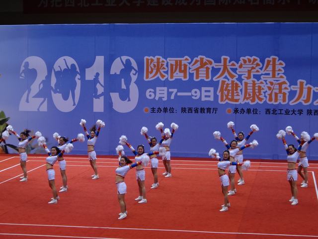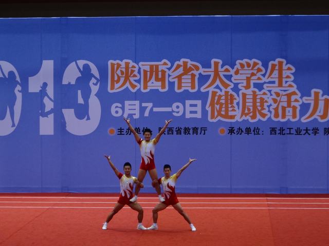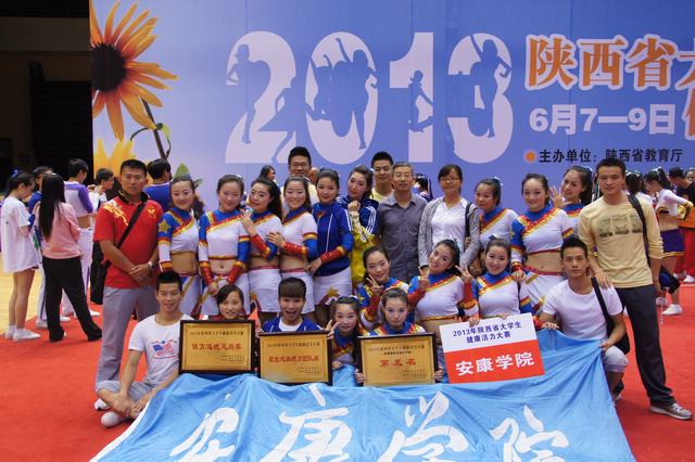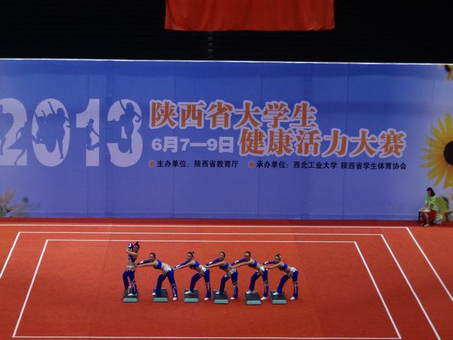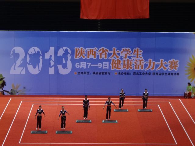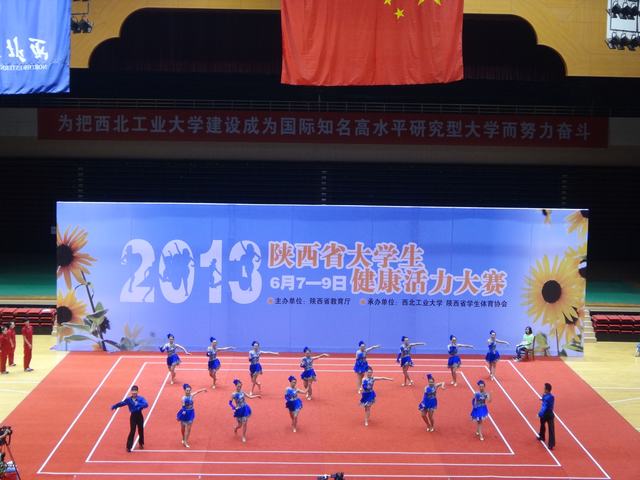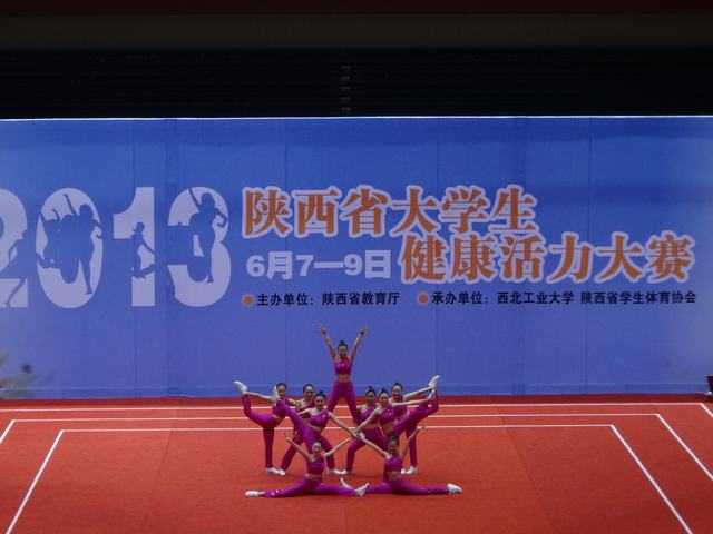 陕西省大学生健美操活力大赛于2013年6月7—9日在西北工业大学翱翔体育馆举行,来自全省43所高等院校的1019名运动员参加了大赛。我校20名健美操精英组队参加了体育院系及高水平组(共九个院校)比赛,经过奋力拼搏,在报名参加的八个单项中,获得啦啦操花球和健身排舞两个第二名、啦啦操花球自编第三名、以及五个第四名、两个第五名,夺得体育院校及高水平组总分第五名,并获得大赛“健身活力团队奖”、“体育道德风尚奖”,郭佳凝同学被评为大赛“优秀运动员”。