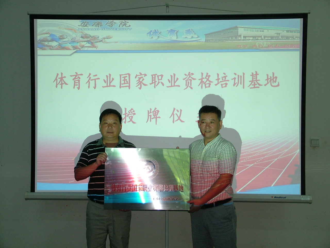 9月4日下午,安康学院“国家体育行业职业培训基地”授牌仪式在体育系会议室隆重举行。出席本次授牌仪式的领导有:陕西省人力资源中心主任、鉴定站站长郭文;陕西省人力资源中心职鉴部部长屈翔燕;安康学院体育系主任冯德学、副主任鲁宗成、吕仙利。体育系部分专业教师及学生代表参加了授牌仪式,体育系主任冯德学主持了授牌仪式。