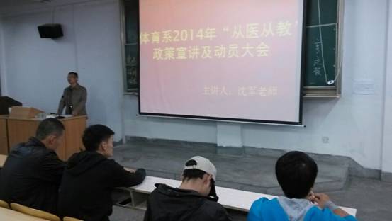 2014年9月17日晚七时半,我系党总支书记沈军老师主持召开了2011级、2012级150余名学生参加的“2014年从医从教政策宣讲及动员大会”。会上沈军老师结合我系前三届毕业生就业状况,就近两年就业形势,分析了体育专业学生的就业方向、我系同学就业着眼点、国家对大学生就业扶持政策等向同学们进行了宣讲动员。鼓励同学们利用在校的一到两年时间,积极参加社会实践,挖掘自身能力潜力,了解社会需求,提高就业竞争力,尽快找到适合自身发展的就业岗位。