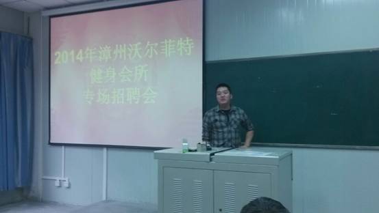 2014年9月17日上午十时,我系在1025教室举办了“沃尔菲特健身会所”专场招聘会,我系就业实习基地沃尔菲特健身会所总经理乐建勇先生专程从福建漳州来到我系,向2014级70余名同学介绍了会所的基本情况,公布了招聘岗位、薪资待遇。通过咨询了解,已有12名同学有了就业意向。
