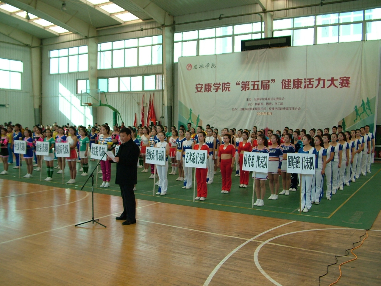 2014年12月3日—5日,由安康学院体育运动委员会主办,体育系、政治与历史系、学工部、团委共同承办的安康学院第五届健康活力大赛预赛和决赛分别在江北和江南两个校区先后进行。5日下午2:30举行决赛阶段比赛,安康学院体育运动委员会秘书长冯德学致辞,安康学院体育运动委员会副主任钟生海教授宣布决赛开始。各院系党总支书记,学工部、团委、保卫处等部门领导观看了比赛。决赛开、闭幕式由体育系副主任吕仙利主持。
