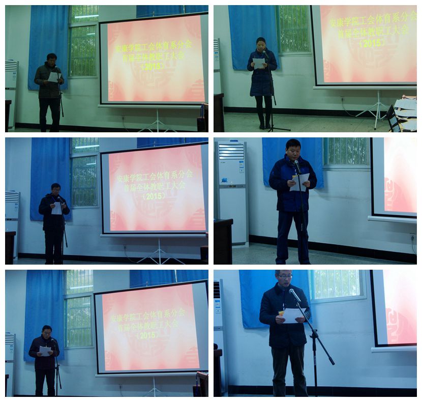 2015年1月10日上午八时三十分,在雄壮的国歌声中,安康学院工会体育系分会首届全体教职工大会胜利召开。学院党委副书记、纪委书记闵小平、学校工会专职副主席许宝林、学校团委副书记肖红香出席大会开幕式并分别致辞。学校办学顾问熊正英应邀出席了大会,4名体育系学生列席了大会,体育系副主任、教工党支部书记鲁宗成致开幕词。开幕式由体育系工会副主席马玉琴主持。