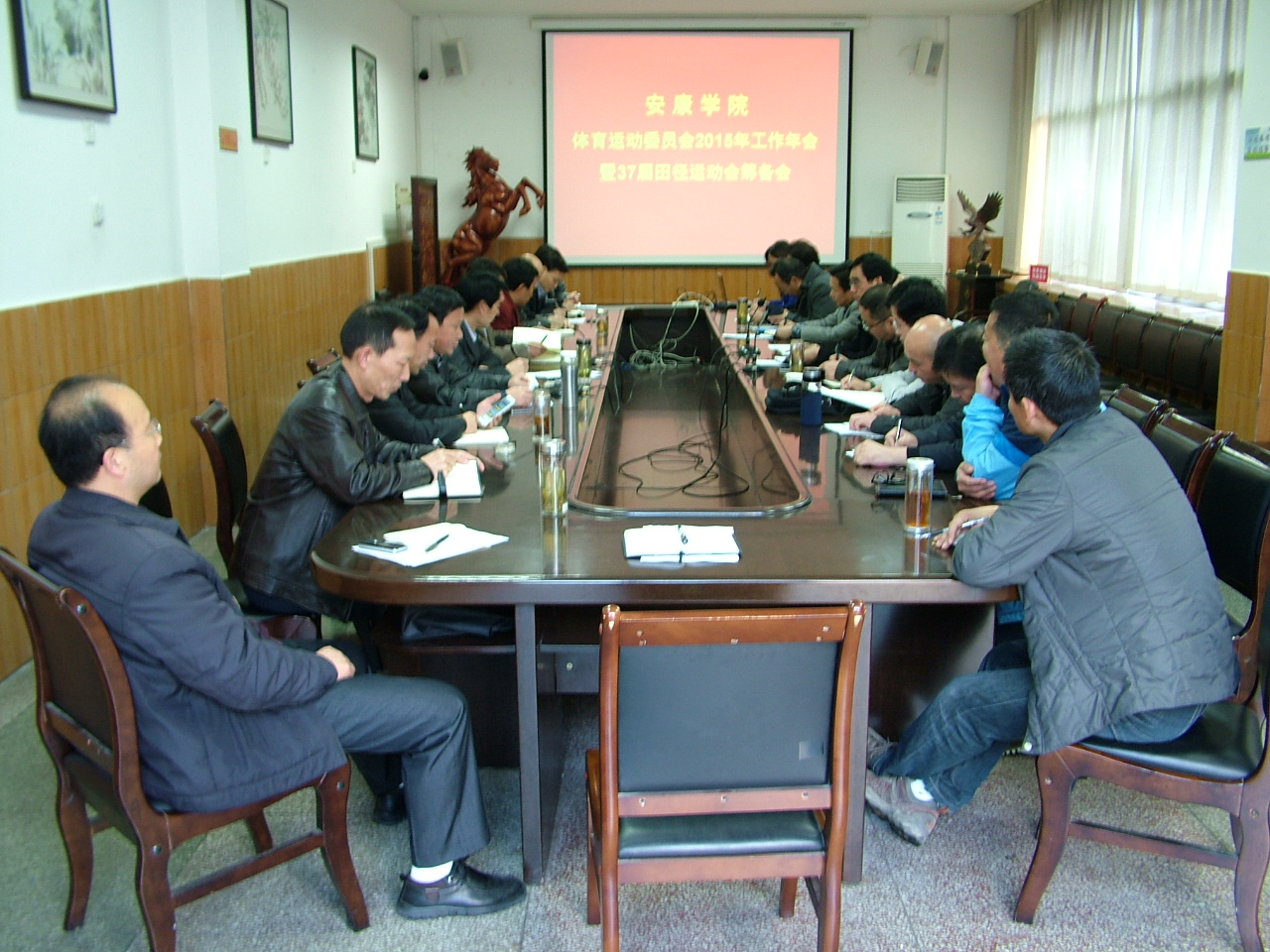 3月20日下午,我校体育运动委员会2015年工作年会暨37届田径运动会筹备会议在江南校区第一会议室召开。学校体育运动委员会主任、党委副书记胡鸿晓和全体委员参加了会议。会议由胡鸿晓主持。