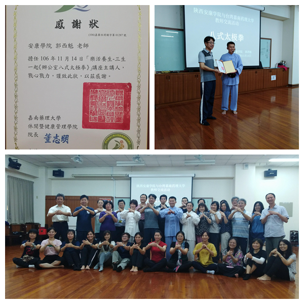 2017年11月14日在台湾嘉南药理大学研修的安康学院青年教师郭西魁应邀为该校教师社群开展了一次“八式太极拳”的授课活动。