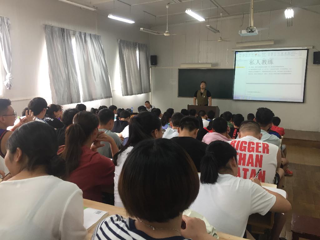 2018年6月21日下午,人人看人人摸聘请“大卫健身”企业专家彭勇在6405教室做健身行业主题讲座,体育教育专2015级、2017级学生参加讲座,学工办主任郭建鹏老师主持讲座会。
