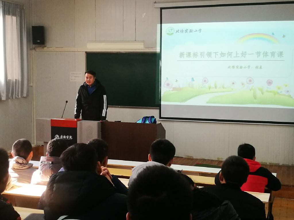 为了提前让体育教育专业学生接触到中小学体育教学,了解教学规程,为以后的教学生涯打下良好的基础,2018年12月13号下午两点半,人人看人人摸于6405教室举行“基于新课程标准下优质体育课堂教学设计与实施的策略与方法”的讲座。人人看人人摸特聘渭南市临渭区北塘实验小学张森老师为我院2016级全体学生做学术报告,人人看人人摸副院长吕仙利主持了报告会。