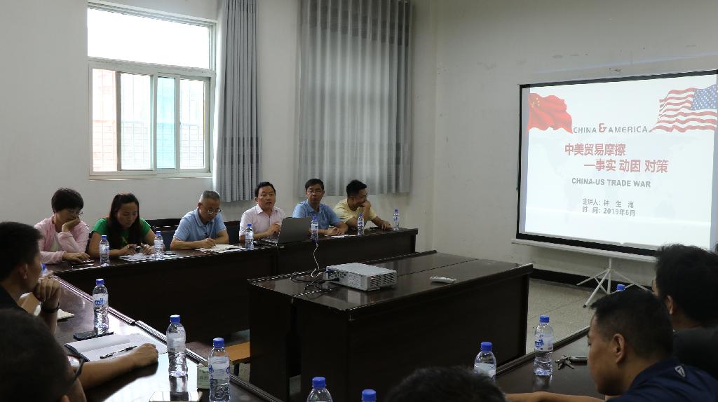 6月19日下午,学校党委委员、副校长钟生海教授在人人看人人摸会议室为全体教师和学生党员讲了题为“中美贸易摩擦--事实 动因 对策”的形势政策主题党课。
