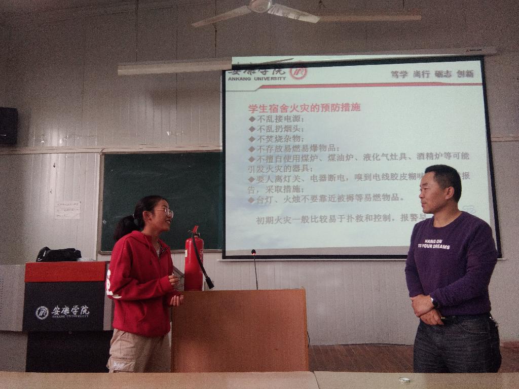 王开忠老师向新生讲解了校园防火、防盗、防骗、交通安全、校园贷、防艾滋病、性侵害、校园欺凌、扫黑除恶等十九个方面的安全问题,着重介绍了校园贷和宿舍火灾的危害。王老师讲解了校园贷里面的一些不为人知的险恶和骗局,让同学们明白了校园贷对当代大学生的危害之深,教育同学们杜绝一切网络贷款和禁止使用贷款软件;在讲到防火问题时,王老师利用现场的灭火器向同学们详细讲述使用方式,以及使用时需要注意的问题。