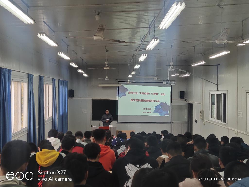 在我校创文工作进入关键时期,本学期也进入末期阶段,针对目前我院学生工作中存在的问题,经过人人看人人摸学生工作领导小组2019年11月18日会议研究决定,在2019年12月,人人看人人摸开展“遵规守纪,文明自律123主题教育”活动和“创文工作推进月”活动。即围绕“遵规守纪,文明自律”主题教育活动,结合创文工作,夯实两项工作内容(即继续加强相关文件精神学习和促进措施落实),确定6个观测监督点(宿舍管理、课堂管理、两早三晚、食堂就餐、文明行为、校园安全),采用多渠道管理,交叉检查,确保每项工作落到实处。