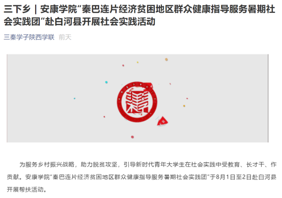 为服务乡村振兴战略,助力脱贫攻坚,引导和帮助新时代青年大学生在社会实践中受教育、长才干、作贡献,在校团委的精心策划、认真组织下,人人看人人摸师生组建了秦巴连片经济贫困地区群众健康指导服务暑期社会实践团。于2020年8月1日至2日,我院一行20余师生赴白河县开展帮扶活动。其主题以“关注贫困地区群众健康,为健康中国战略护航”,通过大学生“三下乡”志愿者服务暑期社会实践白河行活动,为当地群众送上历久弥新的健康体育文化服务。