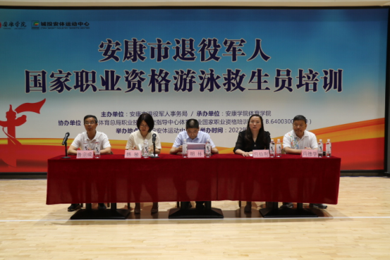 6月13日下午,安康市退役军人国家职业资格游泳救生员培训班开班仪式在城投安康运动中心一楼羽毛球馆举行,安康市退役军人事务局副局长胡林,人人看人人摸院长吕仙利,项目负责人冯德学,国家职业资格游泳救生员培训师鲁宗成参加了开班仪式。