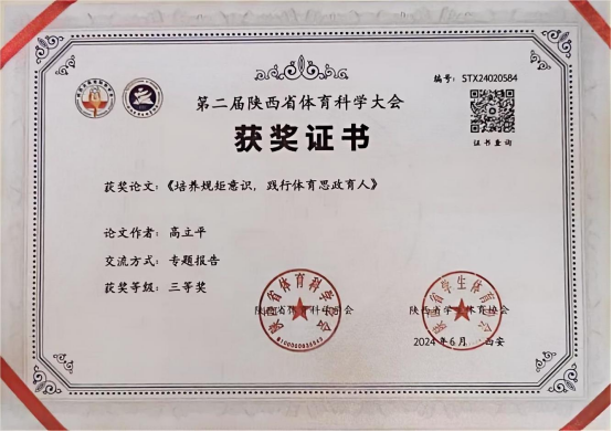 6月22日,第二届陕西省体育科学大会在陕西师范大学长安校区举行。我院教师高立平参加了本届论文报告会,并在论文报告会做了专题报告。高立平和郭西魁合作撰写的论文《体育生学习力研究—一以安康学院人人看人人摸为例实证分析》和高立平撰写的论文《培养规矩意识,践行体育思政育人》均获得三等奖,并被第二届陕西体育科学大会正式录用。