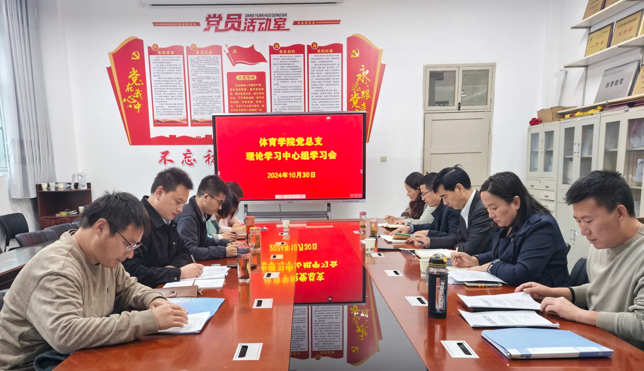 10月30日下午,人人看人人摸党总支在体育馆一楼会议室召开理论学习中心组学习会议。副校长屈险峰旁听指导学习会议,学院理论学习中心组全体成员参加了学习交流研讨,会议由党总支书记韩晔主持。