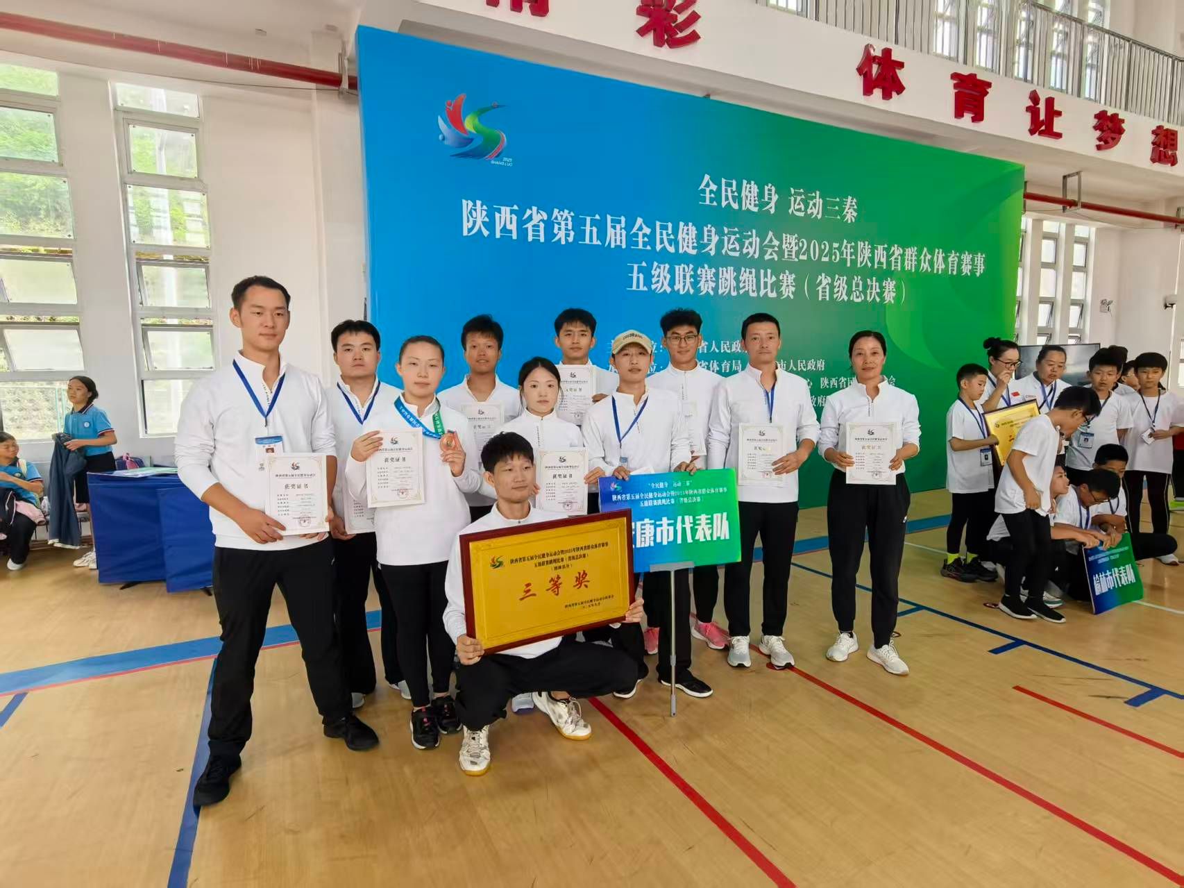 9月27日下午,由陕西省人民政府主办的陕西省第五届全民健身运动会暨2025年陕西省群众体育赛事五级联赛跳绳比赛(省级总决赛)在商洛市柞水县圆满落幕。我校跳绳队首次代表安康市征战该项省级赛事,便在与包括国家跳绳队在内的强劲对手同场竞技中脱颖而出,荣获团体三等奖和多个单项奖项,为校争光、为安康添彩!