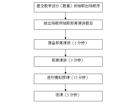 比赛由教学设计、即席演讲、模拟授课、说课四个环节构成。大赛设计学段为初中、小学及幼儿园,内容以课程标准为准,不指定教材。大赛总分为100分,其中,即席演讲满分30分,模拟授课满分45分,说课25分。