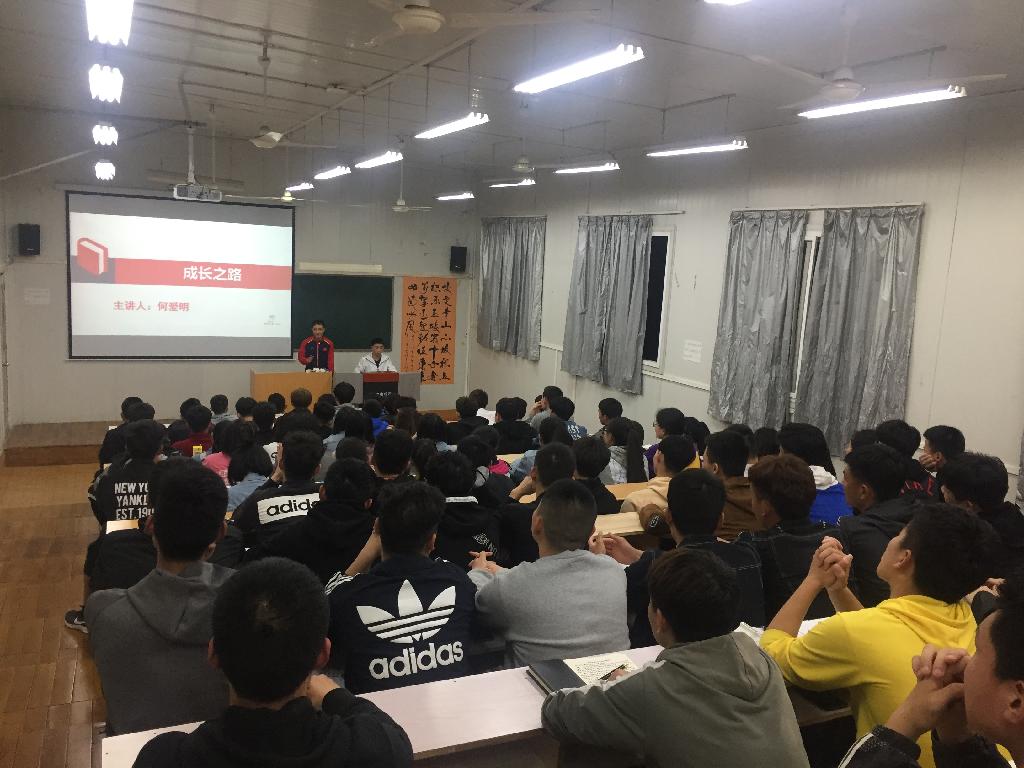 为使人人看人人摸18级学生树立正确的学习目标,顺利度过大学的迷茫期,人人看人人摸邀请2017届优秀毕业生何爱明校友,于3月25日晚在6407教室举办“我的成长之路”报告会。人人看人人摸2018级85名学生参加,学工办主任郭建鹏老师主持报告会。