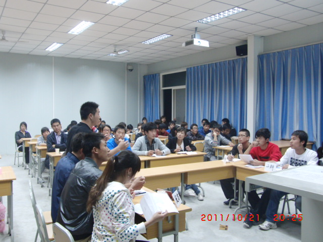 21日晚,辩论赛决赛在1027教室举行,各支队伍及助威团100余人参加了比赛。主持人介绍完辩论赛规则后辩论正式开始。双方辩手开场前先自我介绍以示友好,然后进入到了激烈的辩论中。辩论赛分为五个环节:正反方一辩进行议论陈词;一方的二辩选择对方的二三辩进行攻辩盘问,再由三辩选择对方的二三辩进行攻辩盘问;一辩进行攻辩小结;双方进行自由辩论;双方四辩进行总结陈词。比赛在和谐、融洽、热烈的气氛中进行。