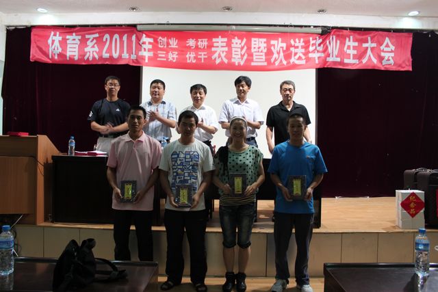 6月27日上午,体育系在1号教学楼六楼报告厅召开了2011年“考研”、“创业”、“三好”、“优干”表彰暨欢送毕业生大会,学院党委副书记胡鸿晓教授、体育系全体教职工和二、三、四年级全体学生参加会议,大会由总支书记冯德学主持。