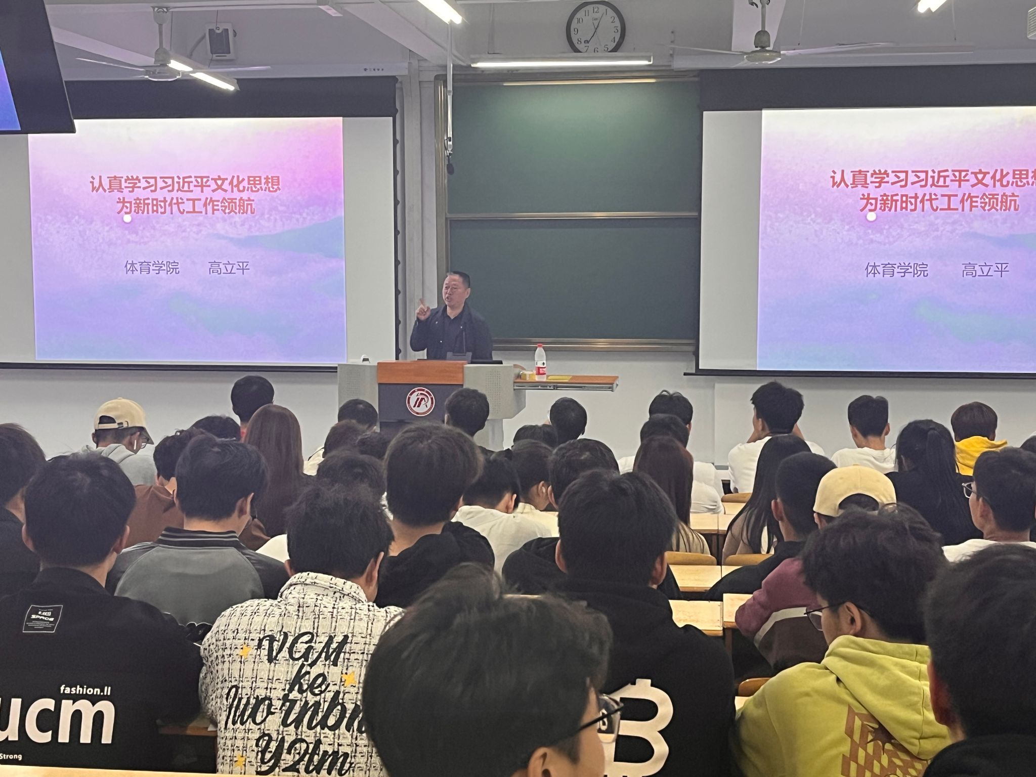 高立平从习近平文化思想首次提出、习近平文化思想的形成 、习近平文化思想的主要内容如首要政治任务、新的文化使命、基本遵循原则及“七个着力”的要求等进行讲解,并引导大学生深入学习好习近平文化思想,加强文化思想自觉,同时与学习习近平新时代中国特色社会主义思想结合起来,读原著学原文、悟原理知原义,坚持全面系统、及时跟进,坚持多思多想、学深悟透,坚持知行合一、学以致用,坚持联系实际、立足岗位,在深学细照笃行中提高理论素养、坚定理想信念、升华觉悟境界、增强能力本领,夯实坚定捍卫“两个确立”、坚决做到“两个维护”的思想根基,以高度的文化自信凝聚民族复兴力量,共同创造属于我们这个时代的新文化,谱写中华民族现代文明新华章。