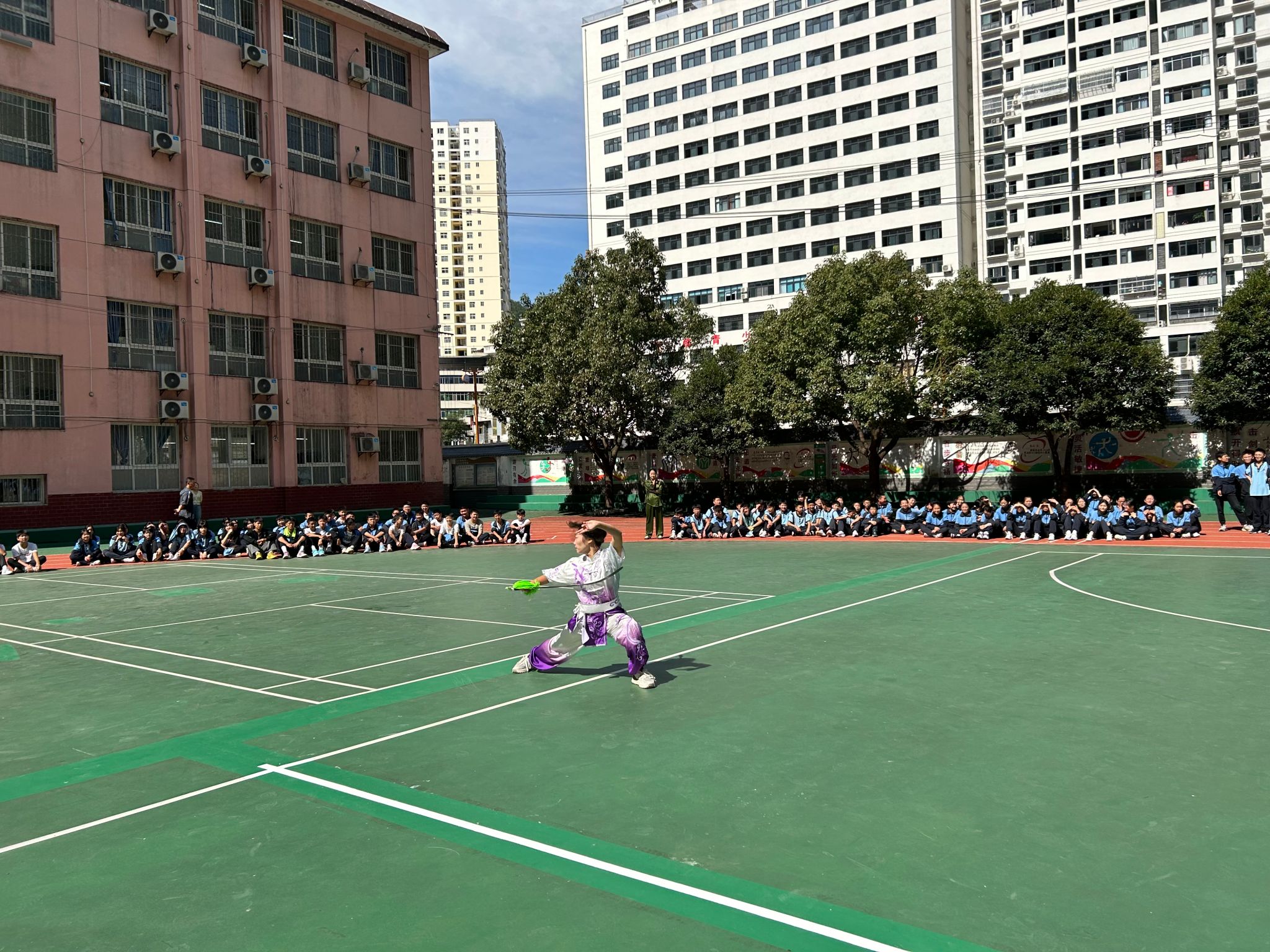 91日上午,高立平为镇平县初级中学师生做了安全教育方面的演讲,随后我院武术队同学将传统文化与校园健身相结合,进行了精彩的展演,并现场进行了八段锦的推广教学,赢得阵阵掌声。下午我院利用本次机会,前往钟宝镇金领村二组对困难学生进行了走访慰问。