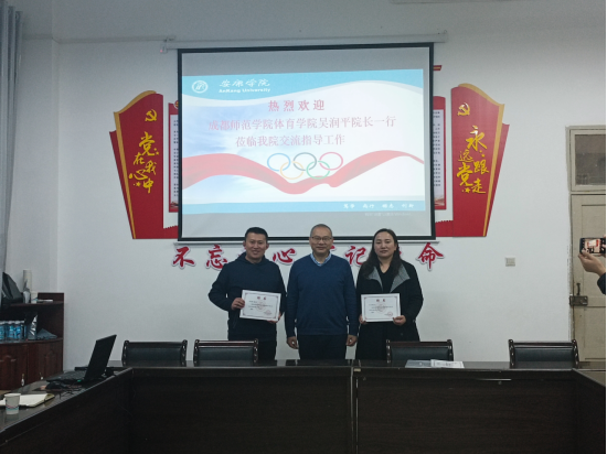 座谈会上,吕仙利院长代表人人看人人摸对成都师范学院人人看人人摸领导一行的到来表示欢迎。随后,吴润平院长介绍了成都师范学院人人看人人摸的办学历程、专业建设、教学管理、师资队伍状况、实验实训条件、学科带头人培养、招生就业、运动竞赛、社会服务等方面的基本情况。并在座谈会上向我院吕仙利、郭西魁、李靖三位教师颁发了指导专家证书。
