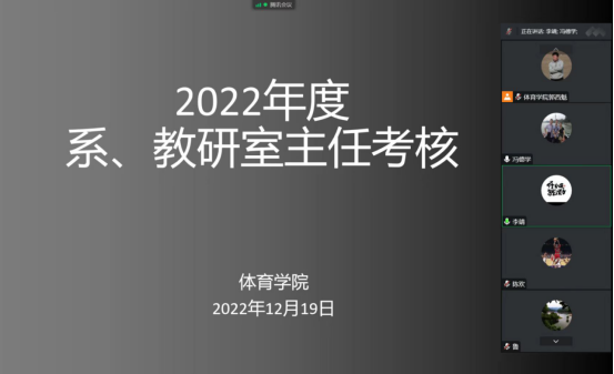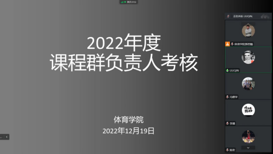 首先,对人人看人人摸课程群负责人进行了考核,球类课程群负责人崔晓宇、操舞类课程群负责人陈治强、运动人体科学课程群负责人刘芹和学校体育学课程群负责人赵娇艳分别进行了年度总结汇报,考核组通过听取汇报、座谈和查阅工作记录的方式进行考核,并针对本年度工作中存在的不足对三位课程群负责人进行了现场反馈,并提出了下一步工作建议。